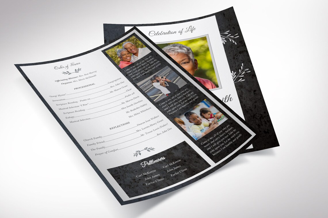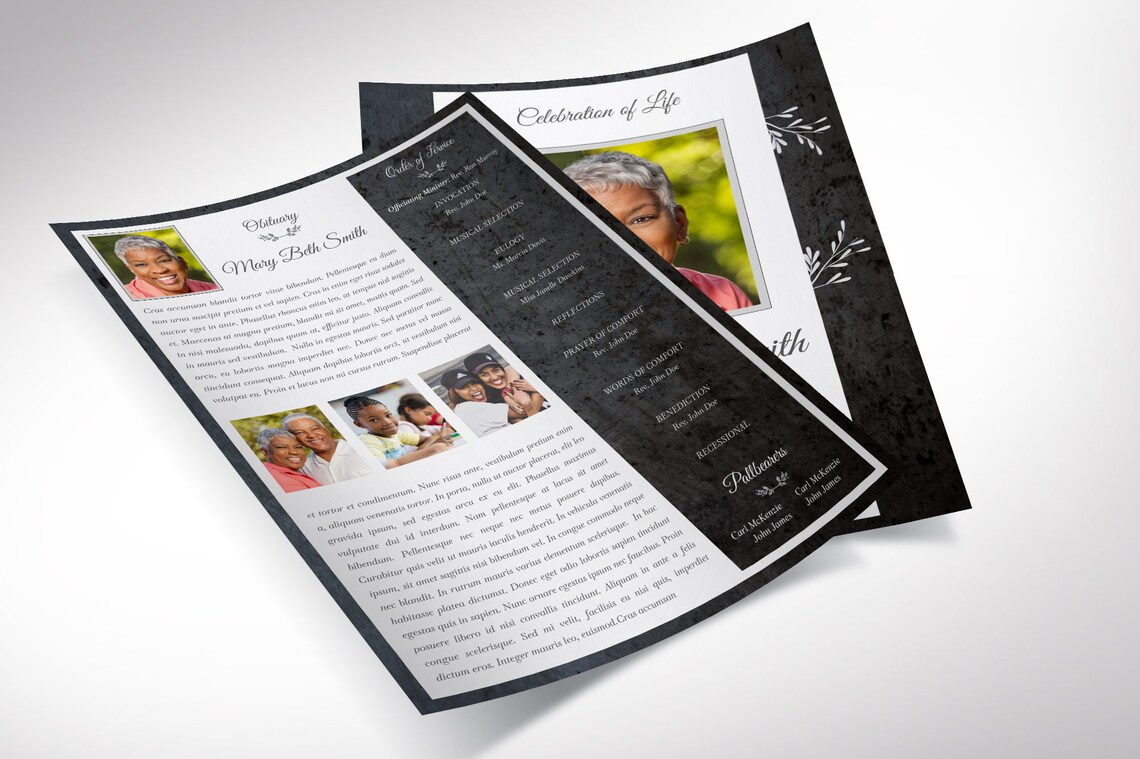 Graystone One Sheet Funeral Program Word Publisher Template, Print Size: 8.5”x11”, is for a creative vintage commemorative or homegoing home. The eulogy 2 pages brochure is designed specifically for funerals but can be edited for memorials and other events.