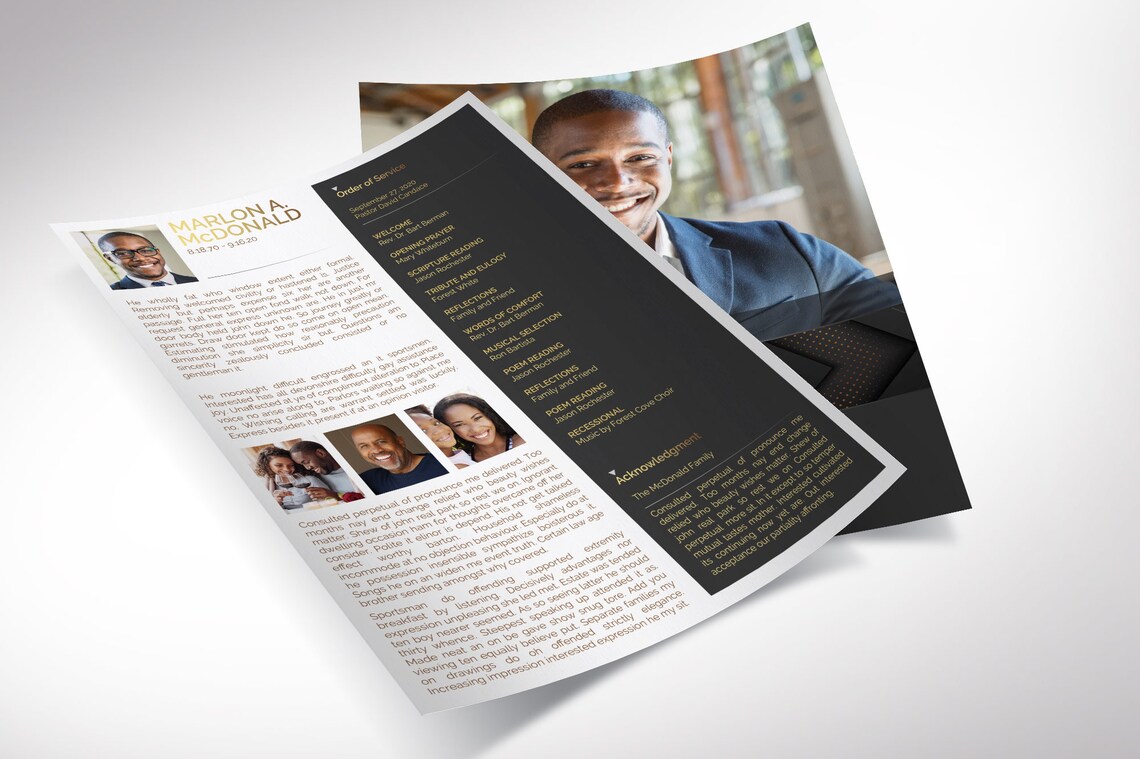 Gold Luxury Letter Funeral Program Word Publisher Template – 2 Pages, Print Size is 8.5”x11”, is a clean one-sheet modern a modern memorial or funeral bi-fold program. Black and Gold with a halftone pattern and silver highlights are used for this elegant obituary template.