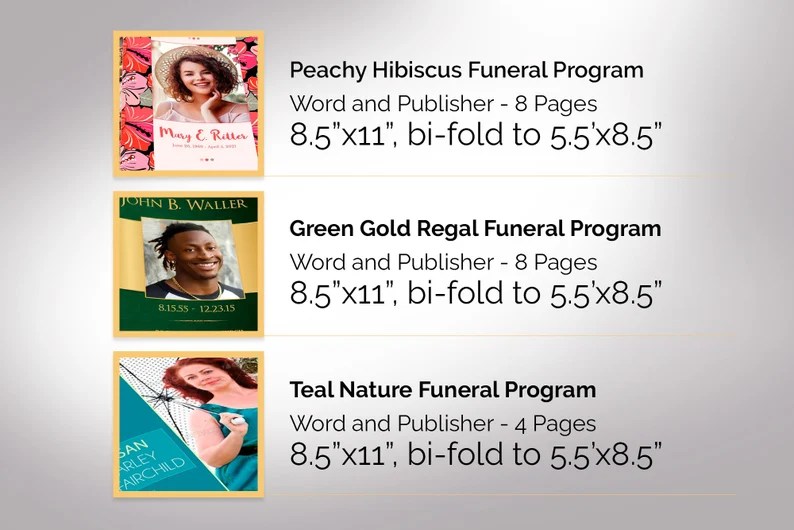 Tropical Funeral Program Bundle is a collection of 6 funeral program brochure templates that have a Tropical or Nature theme. All are editable in both Microsoft Word and Publisher and will refresh your design library.