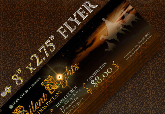 The Silent Night Event Flyer and Ticket Template is intended for any Church Christmas pageant. The flyer and ticket can be edited to be used for any other Christmas event that has a similar theme. Layered Photoshop template is color coded and organized in folders for easy editing. Fonts used can be downloaded with the links provided in the Read Me File. What’s Included: One 8×2.75 Flyer (8.25×3 with bleed) – Front and Back and One 7×2 Ticket with space for Numbering and Perforation.